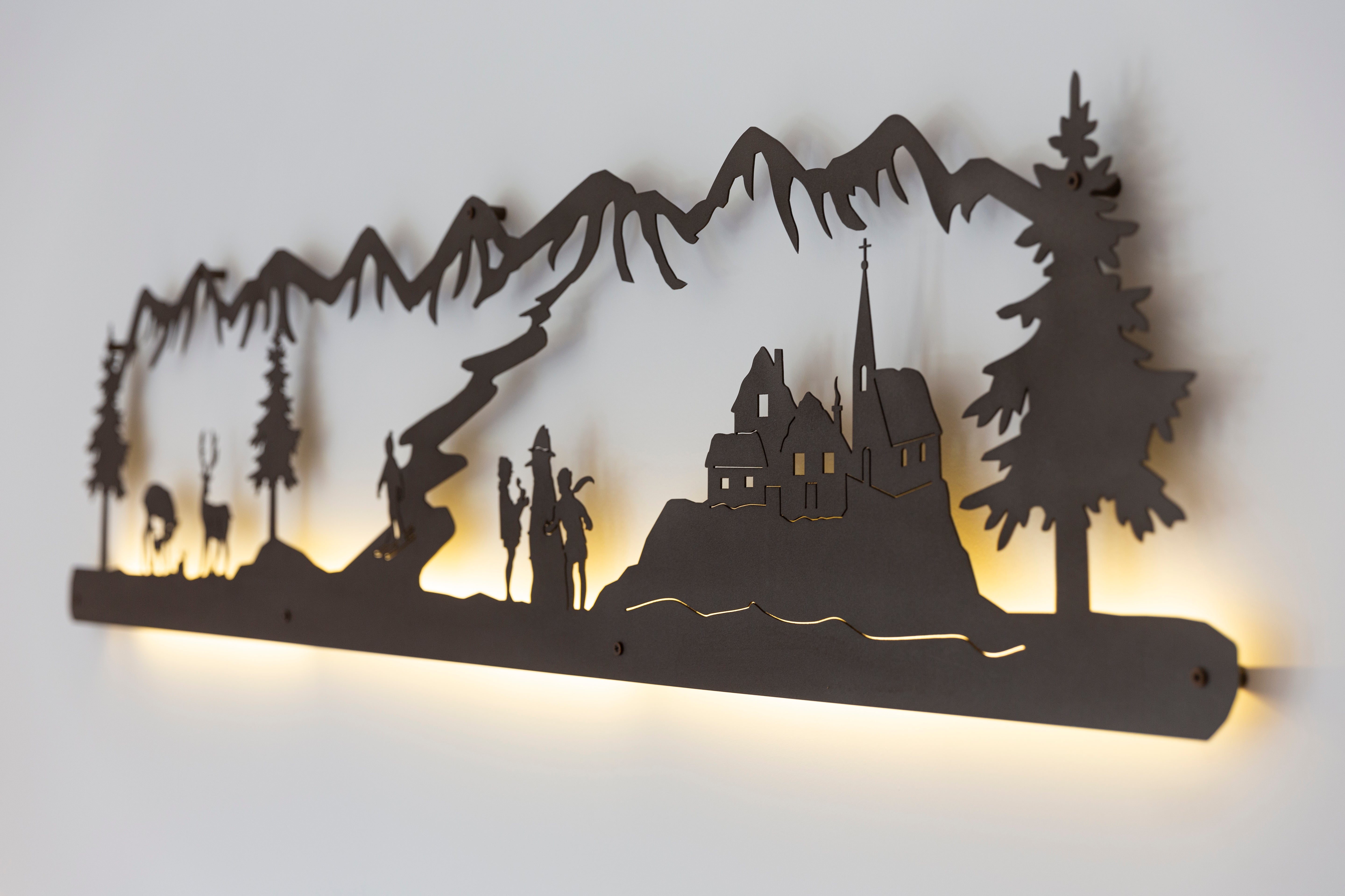 Queste lampade da parete hanno fatto conoscere Il Ferrivendolo al grande pubblico. Raccontano storie di paesini innevati, di cervi e cerbiatti, di pastori e di mucche, di sciatori e arrampicatori... l’atmosfera di montagna dentro casa è garantita!